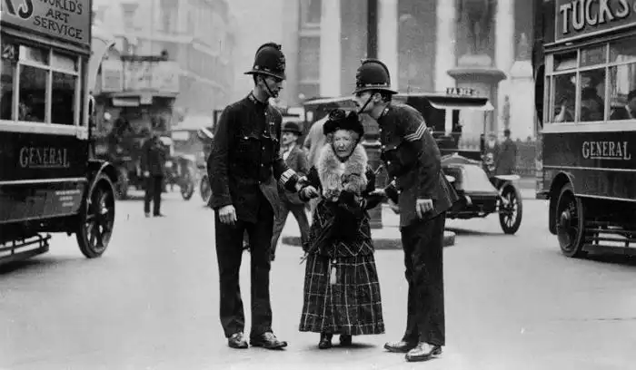 39. Две суффражистки беседуют с полицейским. Лондон, 1912 год.