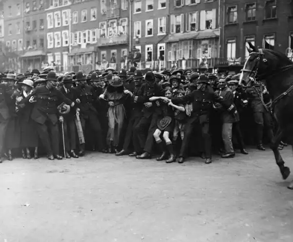 19. Полицейские сдерживают зрителей на параде в Лондоне. Июль 1919 года.