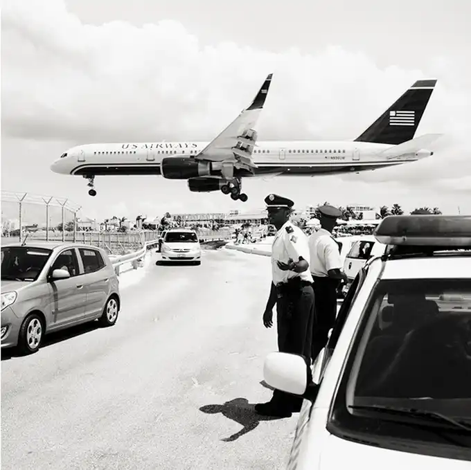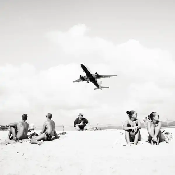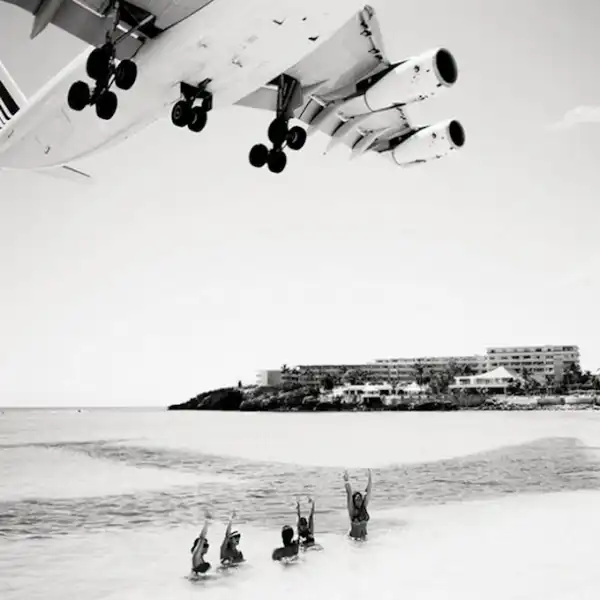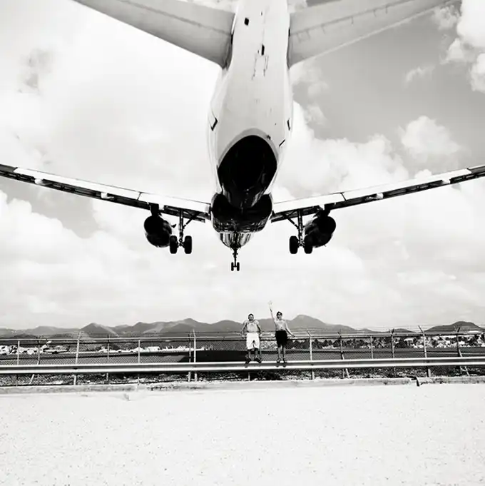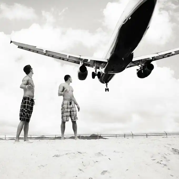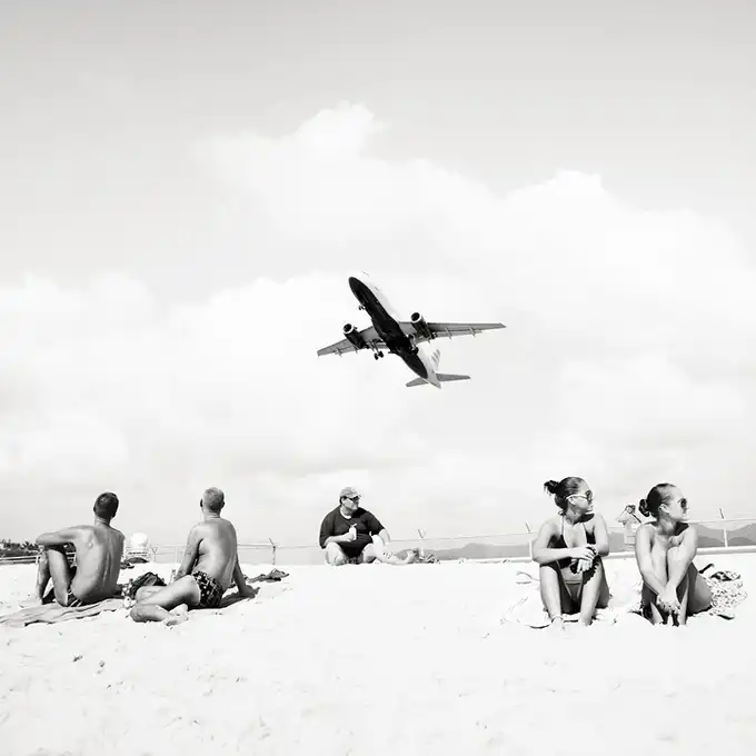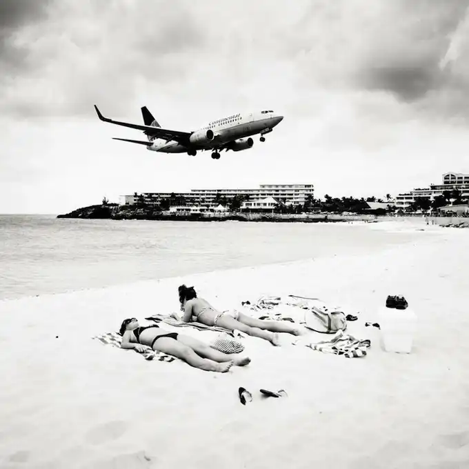 Взлетно-посадочные полосы международного аэропорта принцессы Джулианы так близко находятся к пляжам, что Хофленеру удалось снять моменты взлета и приземления самолетов на широкоугольный объектив. Серия называется "Авиалайнеры". Короткие взлетно-посадочные полосы требуют, чтобы пилоты подлетали к аэропорту всего на 10-20 метров выше пляжа!