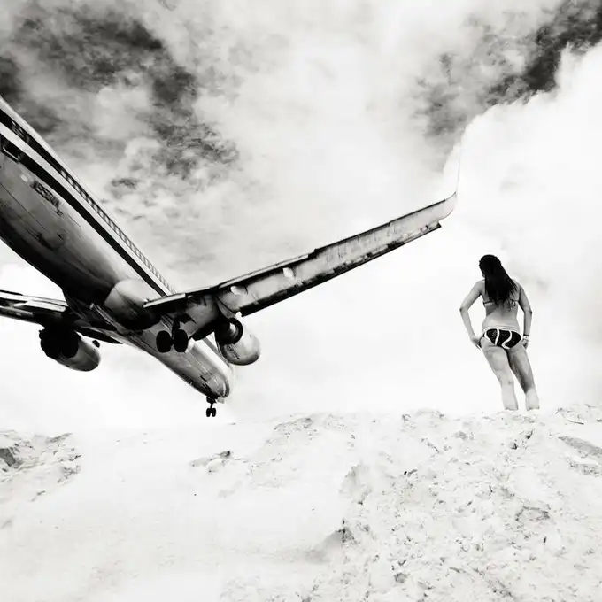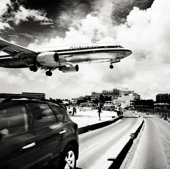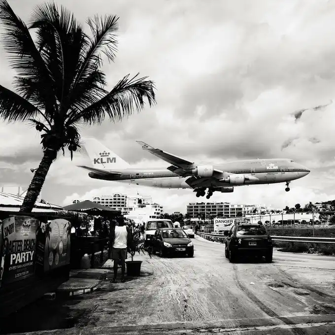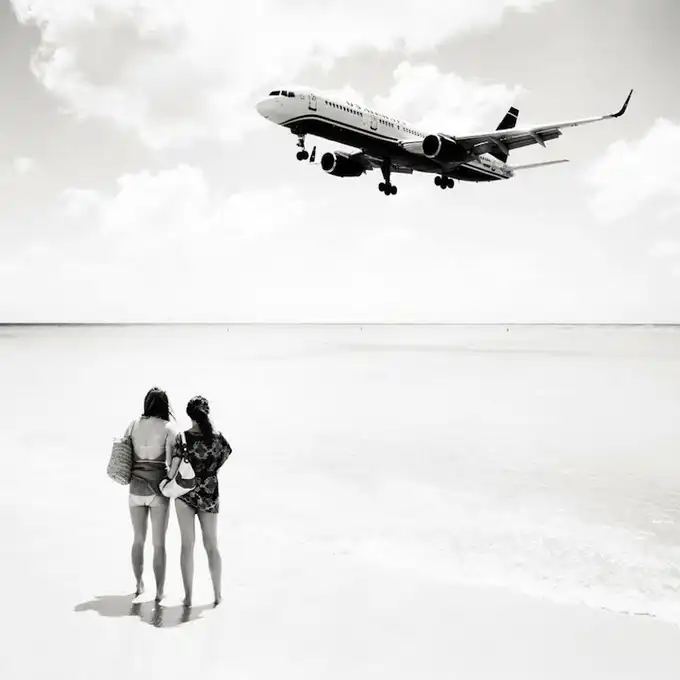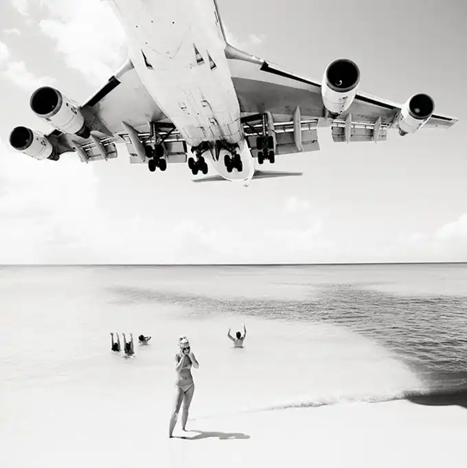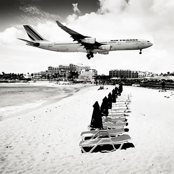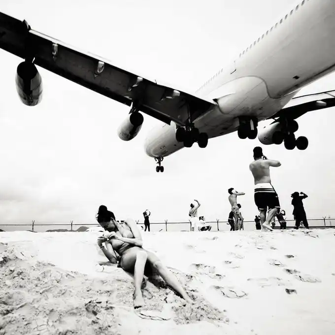 Взлетно-посадочные полосы международного аэропорта принцессы Джулианы так близко находятся к пляжам, что Хофленеру удалось снять моменты взлета и приземления самолетов на широкоугольный объектив. Серия называется "Авиалайнеры". Короткие взлетно-посадочные полосы требуют, чтобы пилоты подлетали к аэропорту всего на 10-20 метров выше пляжа!