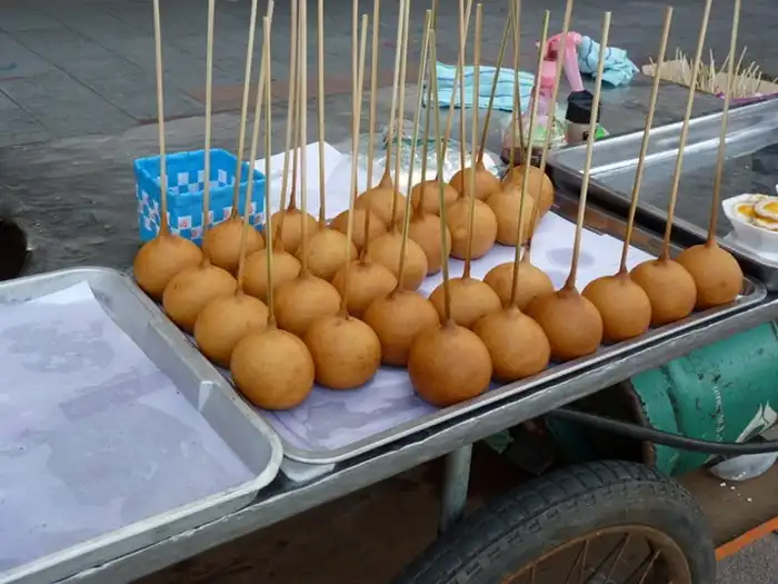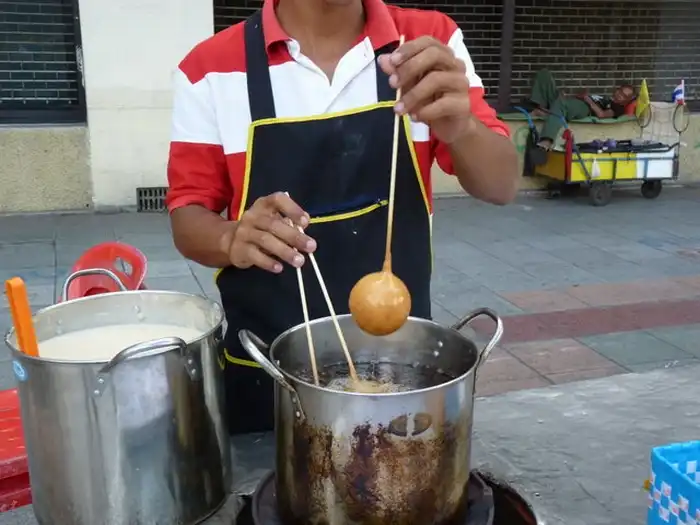 Если вам не довелось наблюдать начало приготовления горячей вкуснятины, то вы пропустили самое интересное и так и не узнаете, что там внутри. Пока не купите лакомство. Стоят «колобки» 15 бат — это примерно столько же рублей. Чтобы приготовить «колобок», его пару раз макают в тесто жидкой консистенции, а потом жарят в растительном масле.