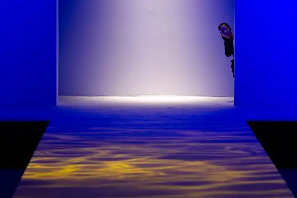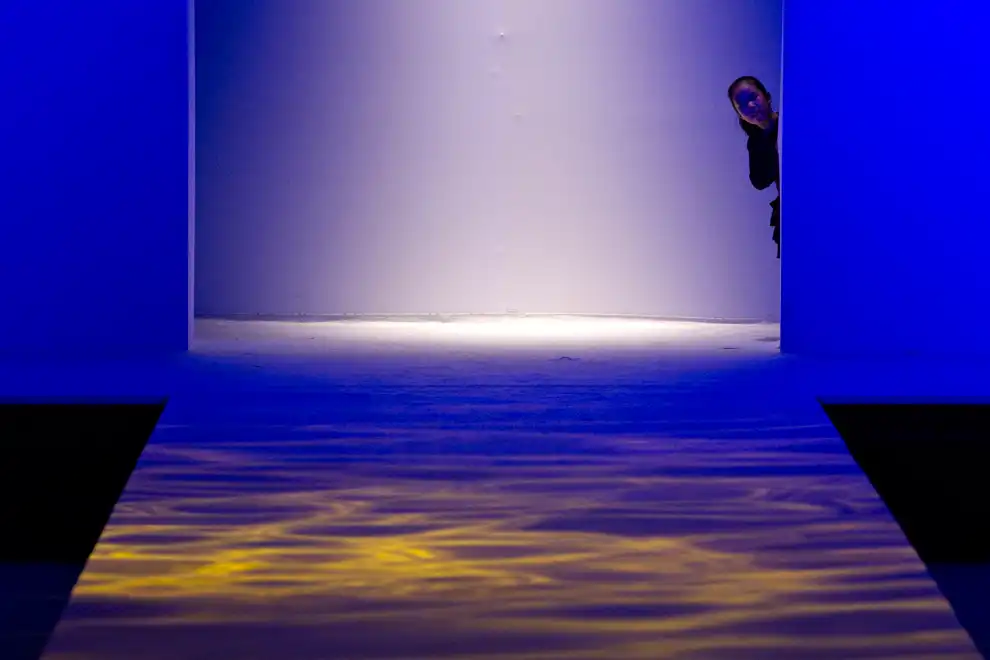 Девушка смотрит на подиум из-за кулис перед показом мод в Пекине, Китай.
