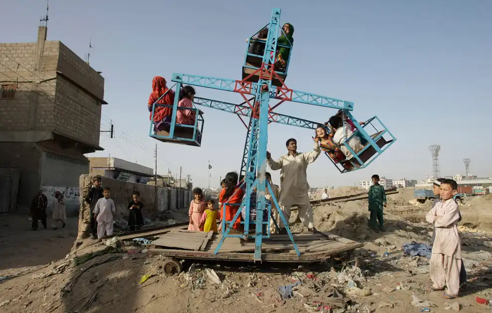 Дети катаются на качели в районе трущоб в Карачи, Пакистан.