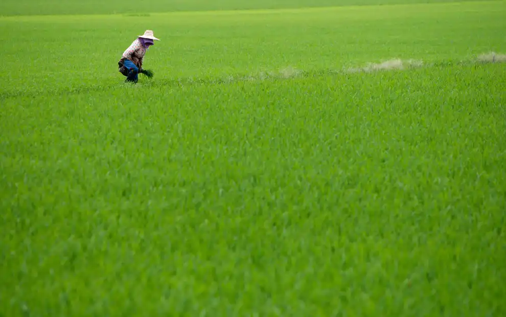 Фермер работает в рисовом поле на окраине Куала-Лумпура, Малайзия.