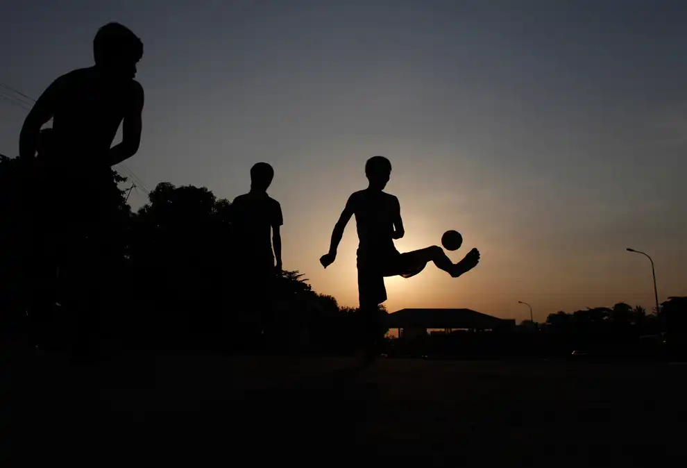 Подростки играют мячом у реки Янгон в Янгоне, Мьянма.