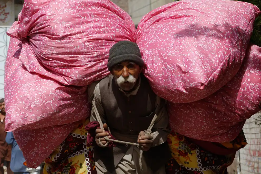 Пожилой мужчина носит мешки с хлопком, чтобы заработать себе на жизнь, в Пешаваре, Пакистан.
