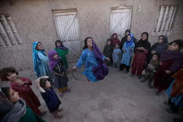 Афганская девочка прыгает через веревку, играя вместе с другими детьми в районе трущоб на окраине Исламабада, Пакистан.