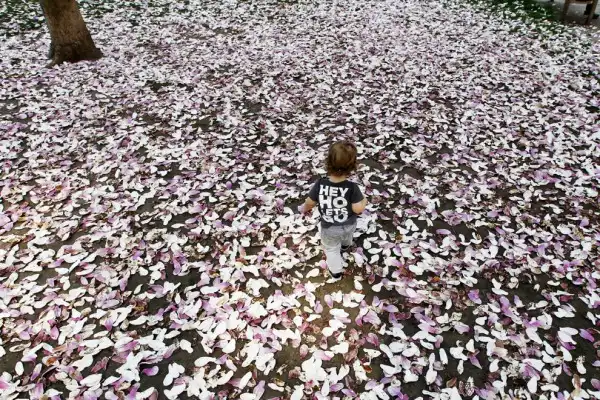 Лиам Фокс гуляет среди опавших лепестков цветущего дерева на площади Rittenhouse Square в Филадельфии, США.