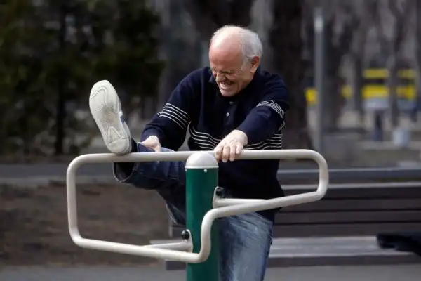 Мужчина растягивается после пробежки в парке в центре Белграда, Сербия.
