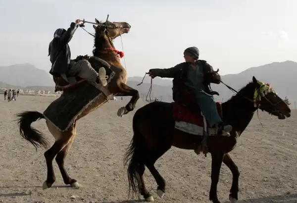 Афганцы скачут на лошадях по холму с видом на Кабул, Афганистан.