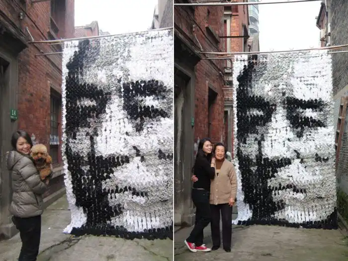 Одна девушка сплела портрет из носков, прикрепив их на бамбуковую основу.