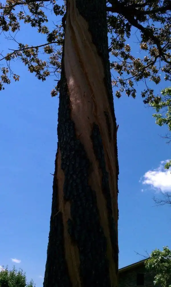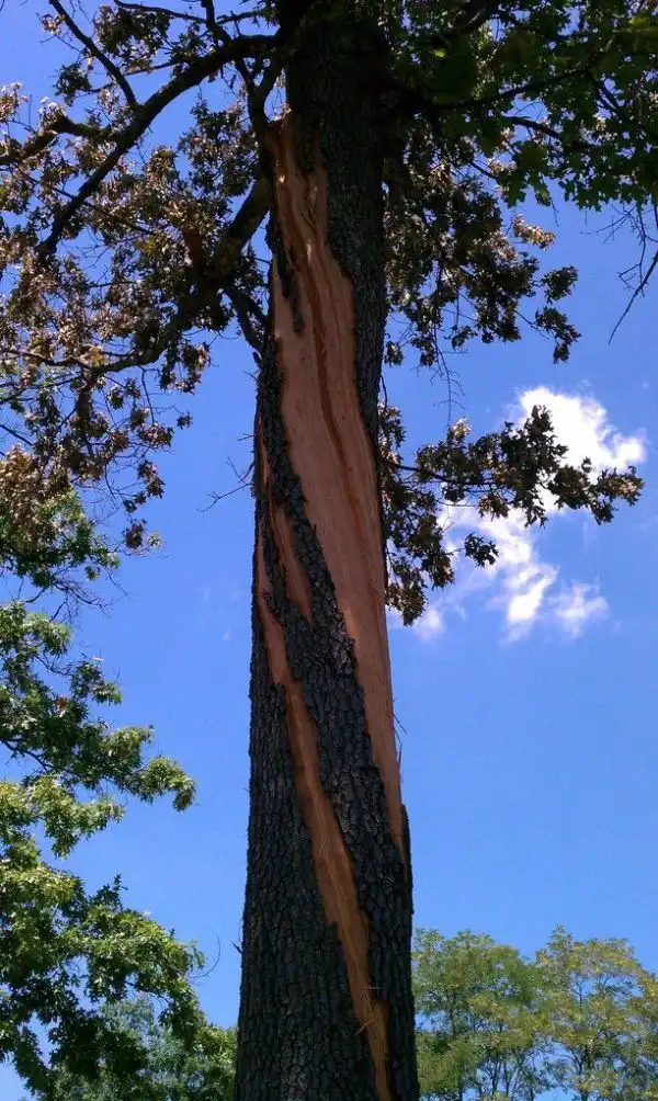 Удар молнии оставил глубокие шрамы на коре дерева.