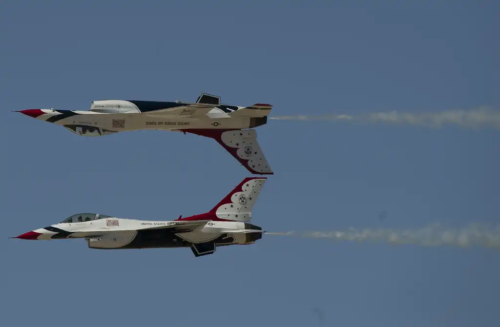 12. Майор Аарон Джелинек над авиабазой Пис Национальной Гвардии США во время авиашоу , 14 августа 2011 года. Джелинек - лучший пилот из группы "Тандербердс". (U.S. Air Force photo by Staff Sgt. Larry Reid Jr.)