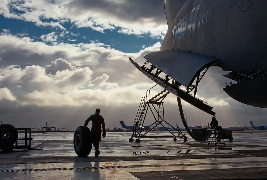 10. Старший техник Джастин Эванс, командир подразделения из 60-го отряда технического обеспечения с колесом от самолета С-5 "Гелэкси" на авиабазе Тревис, Калифорния, 6 октября 2011 года. (U.S. Air Force photo by Lt. Col. Robert Couse-Baker)