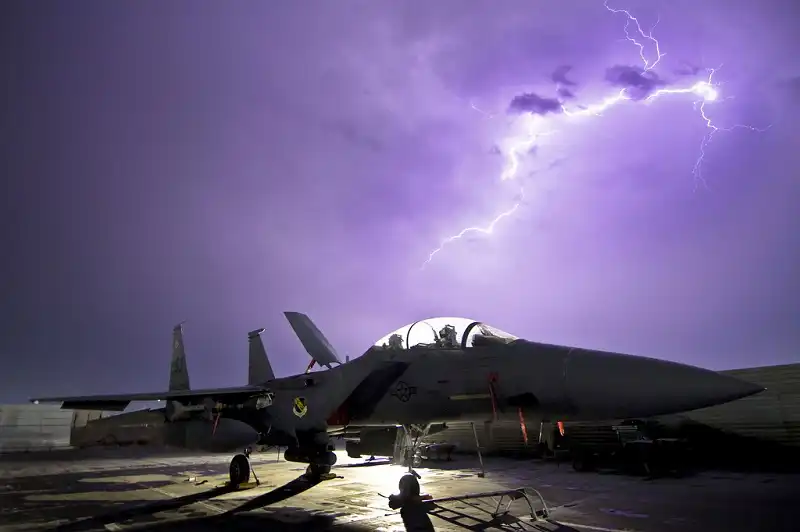 17. F-15 "Страйк Игл" 390-й истребительной эскадрильи авиабазы Маунтин Хоум, Айдахо, проводит пробный запуск форсажа на аэродроме 4 Винг Колд Лейк, Канада, 9 июня 2099 года. Совместные учения "Maple Flag 42" предоставляют возможность отрабатывать взаимодействие сил НАТО в воздушном и наземном бою. (U.S. Air Force Photo by Senior Airman Larry E. Reid Jr.)