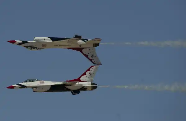 3. F-16 из показательной эскадрильи "Тандербердс" демонстрируют фигуры пилотажа на авиашоу "Legacy of Liberty" на авиабазе Холломэн, Нью-Мексико, 8 октября 2011 года. Главная задача эскадрильи - показать возможности современных боевых самолетов и уровень подготовки пилотов. (U.S. Air Force photo by Senior Airman DeAndre Curtiss)