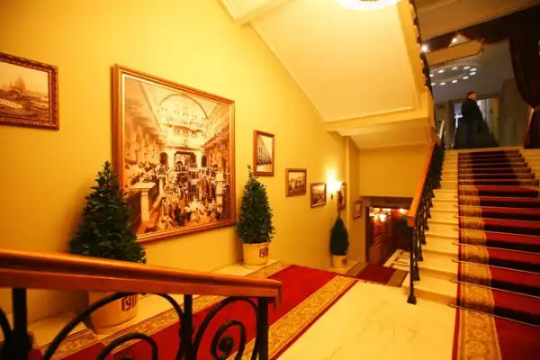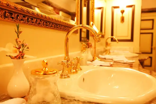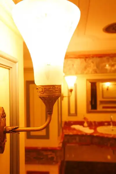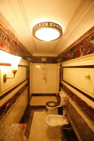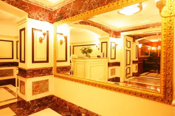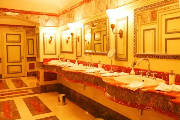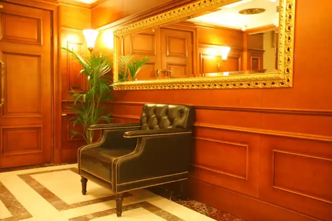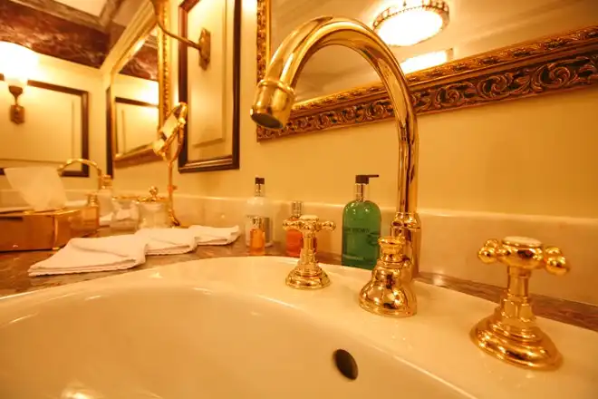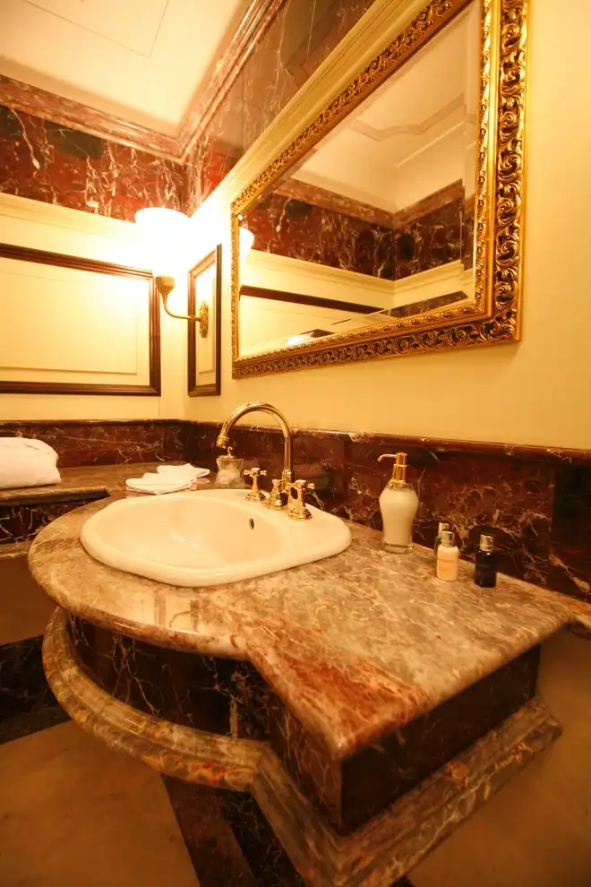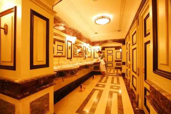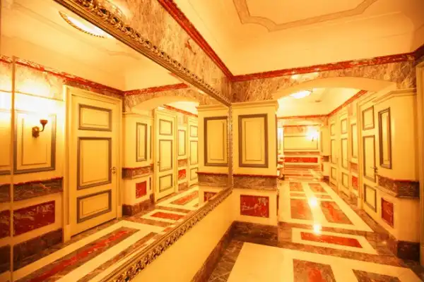 В женском отделении есть и душевая, Зеркала в позолоченных рамах, Богатство интерьера, Светильники – бронзовые, За чистотой следят горничные в накрахмаленных фартуках и белоснежных перчатках, Кожаная мебель в холле, В салон посетители идут по ковровой дорожке, Гостям выдают душистые полотенца, У раковин позолоченные смесители, Здесь есть также и душевая: с тапочками и белоснежными халатами