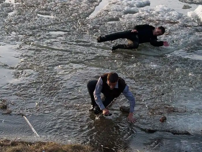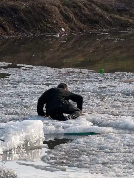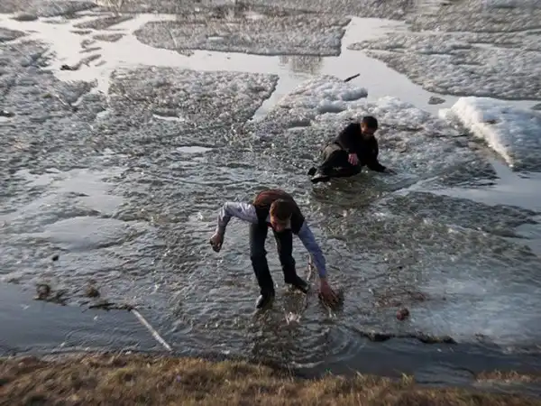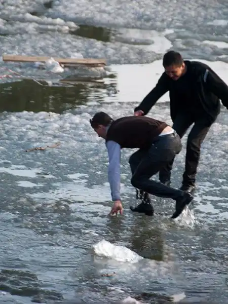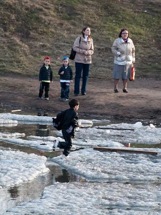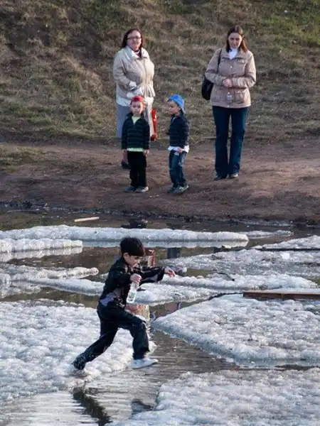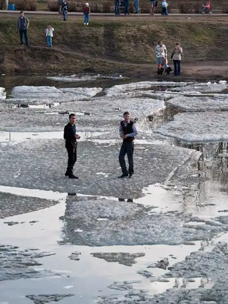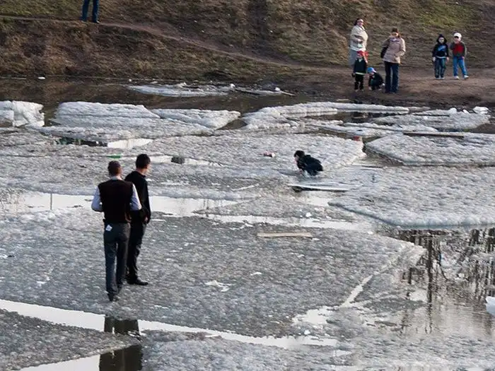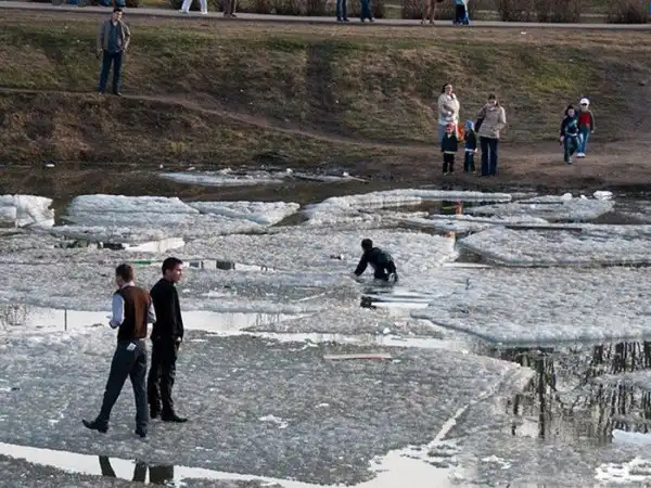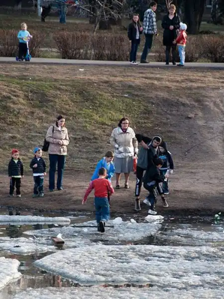 На подтаивавший лед вышли несколько человек и с радостью прыгают с льдины на льдину.