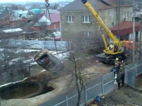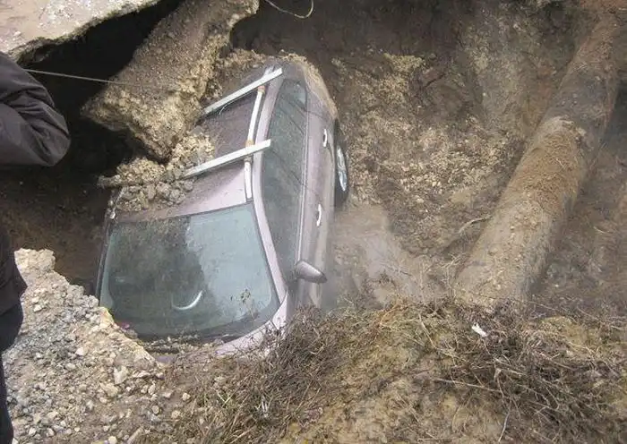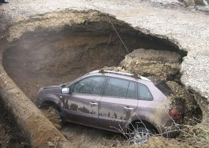 Выйдя из авто он увидел, что передние колеса ушли под землю, а через 10 минут весь автомобиль оказался под водой.