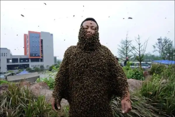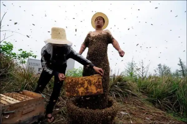 Китайский пчеловод осмелился посадить на вое тело примерно 331 тысячу пчел, что по весу составило 33,1 килограмма.