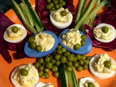 Аккуратно перемешиваем белки и капустную кашу, оставляем на 15 минут. Потом достаём белки и промываем холодной водой. Яйца можно нафаршировать чем нравиться, самой простой вариант - перетереть желтки с майонезом и нафаршировать ими