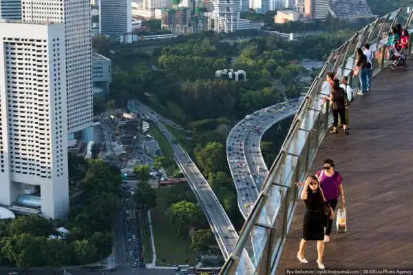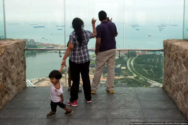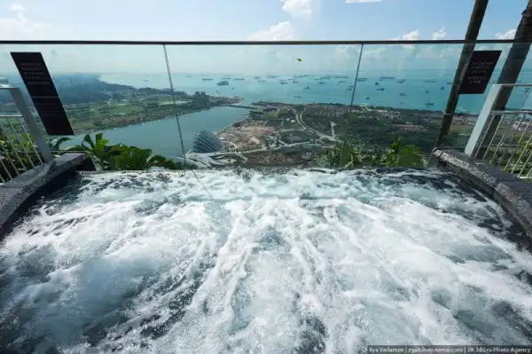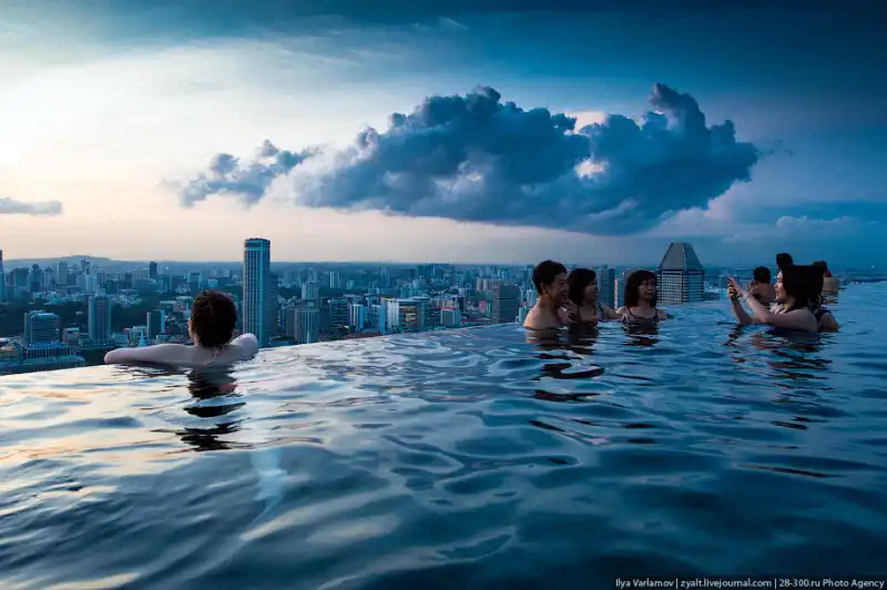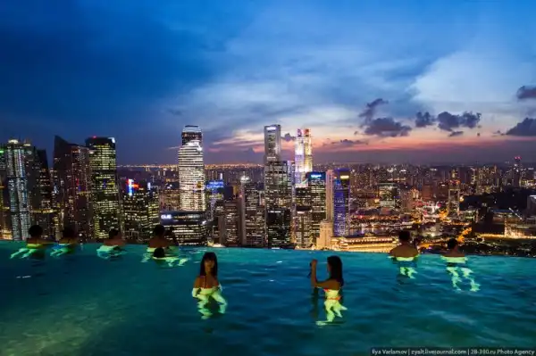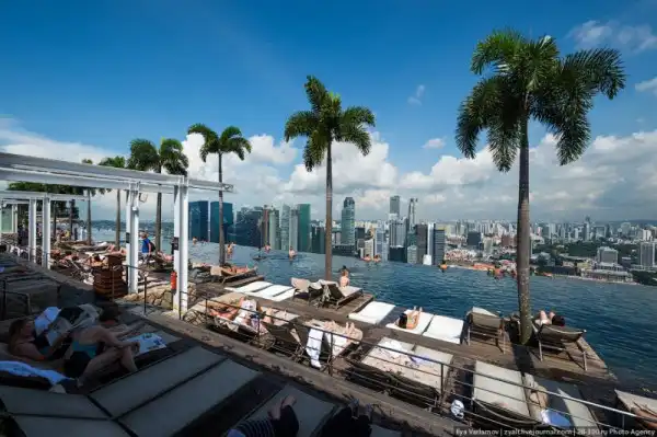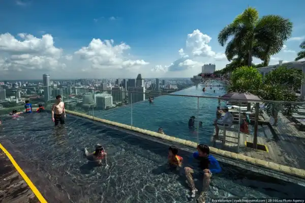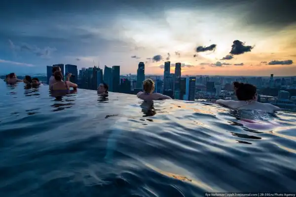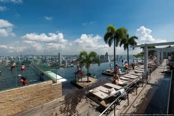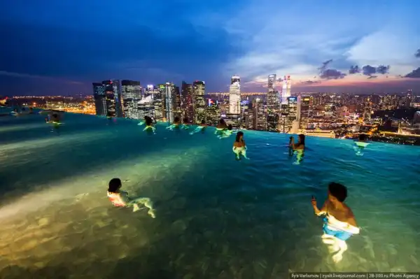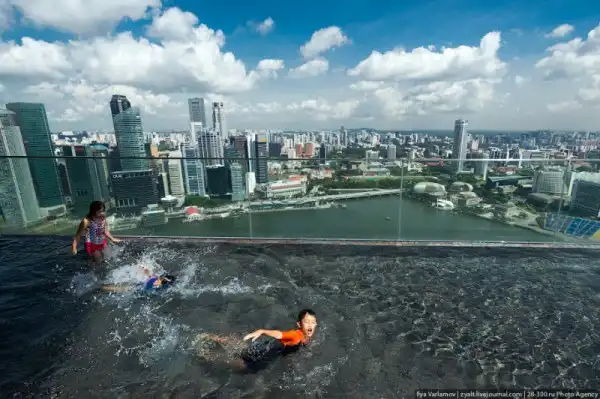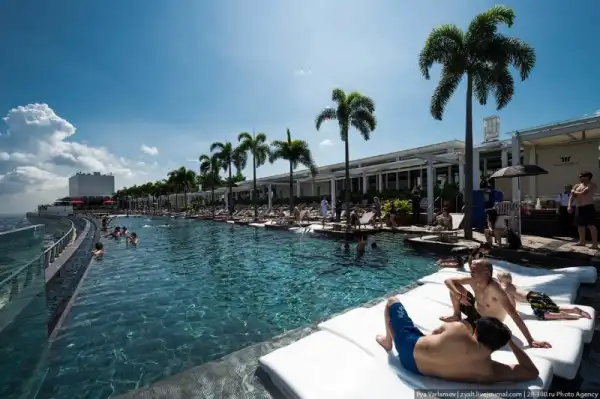 Сегодня я расскажу вам про самый крутой отель на свете, Marina Bay Sands в Сингапуре. На трех башнях высотой в 200 метров (55 этажей) располагается огромная терраса в виде гондолы с бассейнами и зелеными садами общей площадью 12,4 тыс. кв. метров. Главный бассейн, расположенный под открытым небом, не имеет видимых бортиков, из за чего создается впечатление, что кромка воды обрывается на высоте. Бассейн тянется на 150 метров и является крупнейшим бассейном, построенным на таком уровне. В отеле 2500 номеров, торговый центр, конференц-зал, 2 театра, один музей и несколько ресторанов. Постройка отеля обошлась инвесторам в 8 миллиардов долларов. Это самый дорогой отдельностоящий курорт в мире.