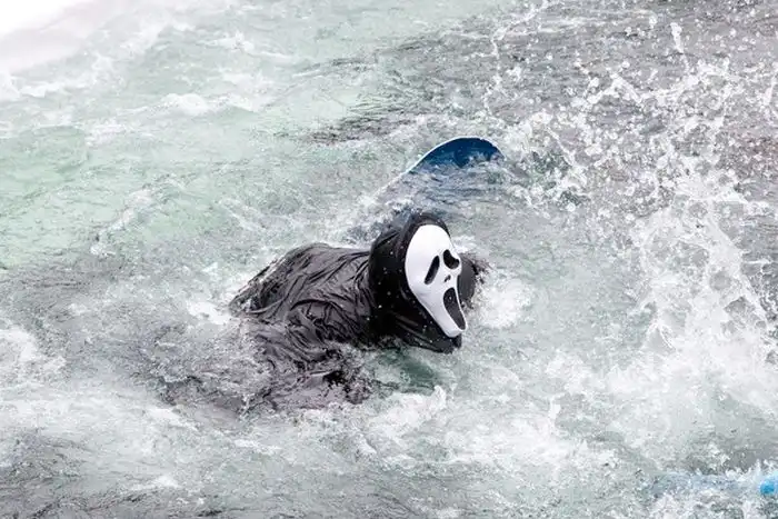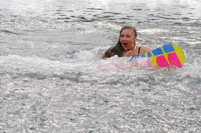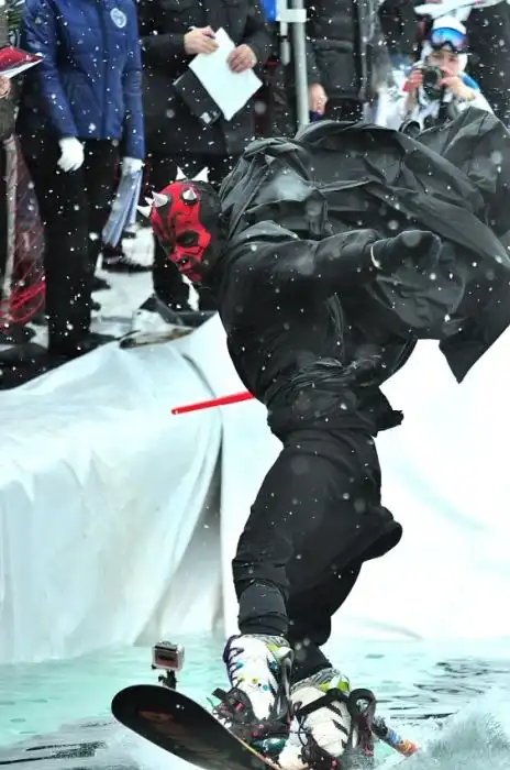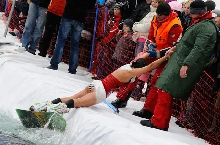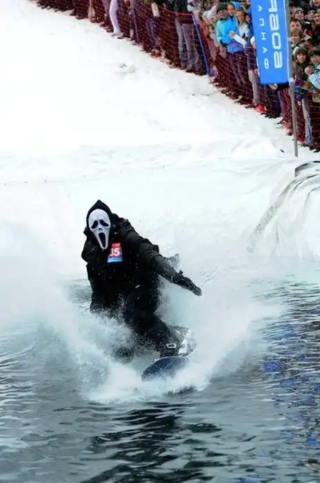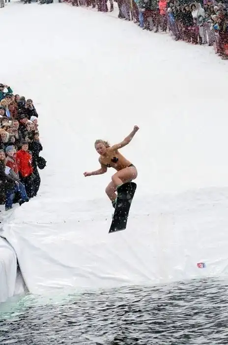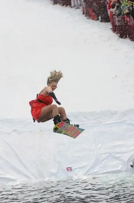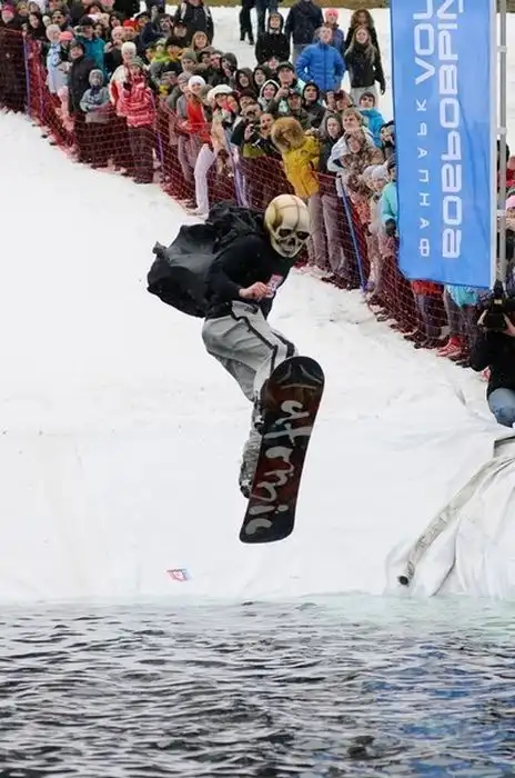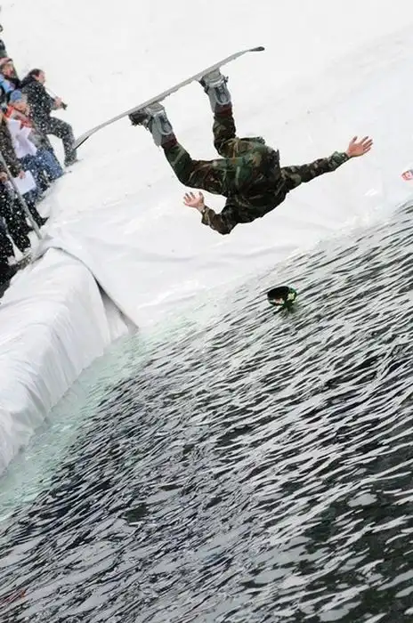 В одном из парков люди на сноубордах скатывались с горы прямо в бассейн,