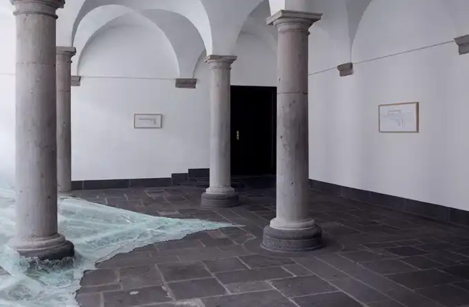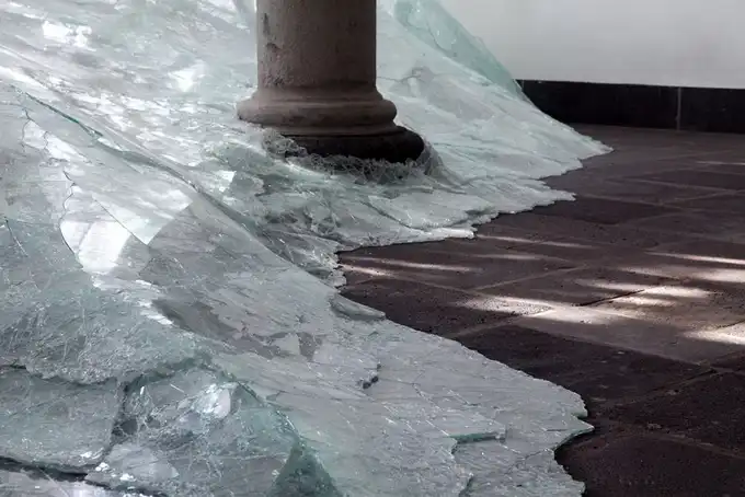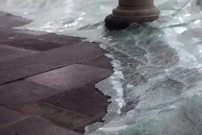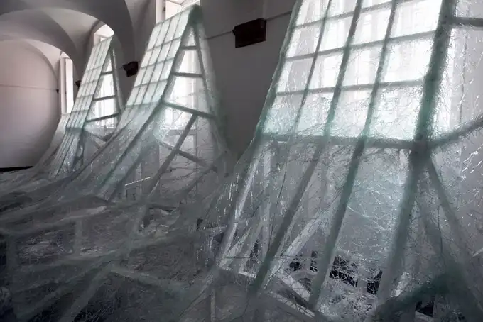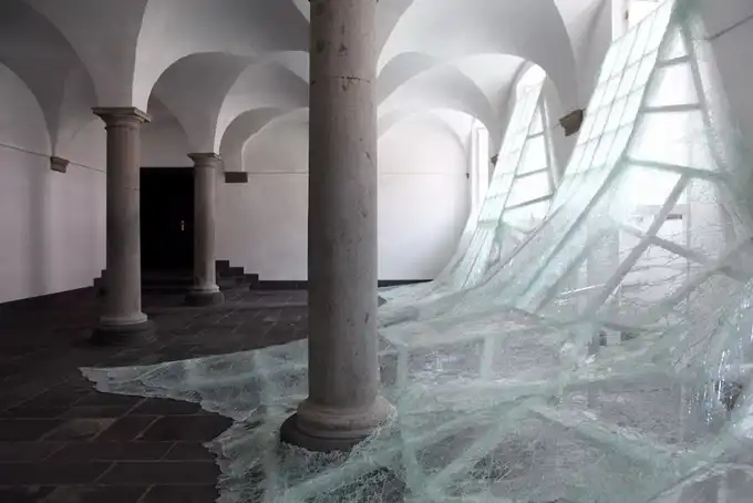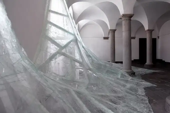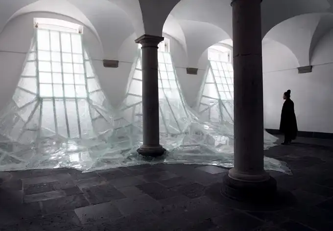 Французский современный художник Баптист Дебомбург (Baptiste Debombourg) представил новую инсталляцию под названием Aerial. Инсталляция находится в старом бенедиктинском монастыре Brauweiler Abbey и являет собой лавину битого многослойного стекла, напоминающую потоп.