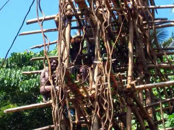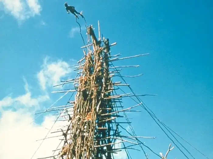 На высокую башню, которая сделана из дерева, вскарабкиваются мужчины,