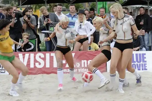 на поле вышли обнаженные девушки из команд Visit-X Camgirls и Blue Movie All Stars, раскрашенные в цвета футбольных сборных Германии и Австралии, соответственно.