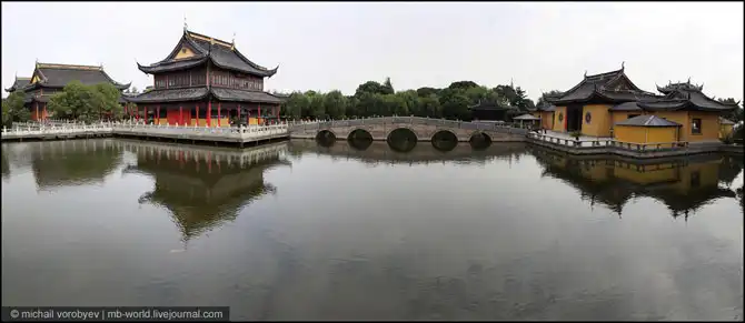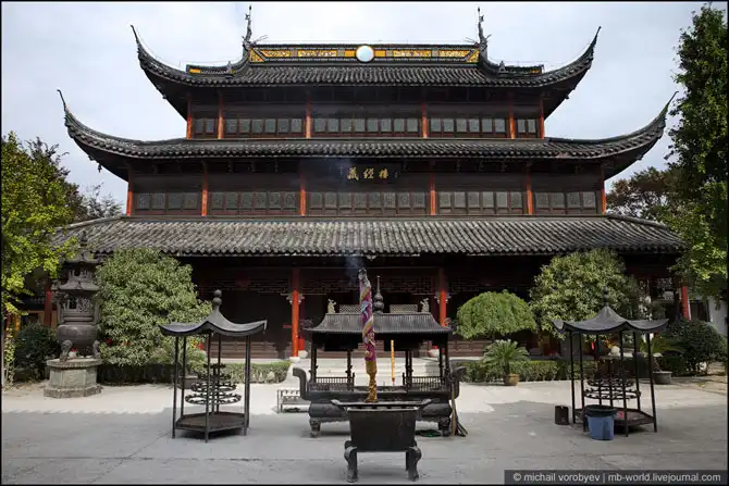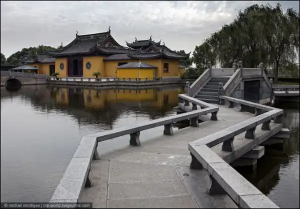 Этот монастырь не огражден стеной, как многие храмы, а «огражден» водой и удивительно красивым садом. Этот сад построил известный поэт того времени Zhang Jiying в 3-5 веке.
