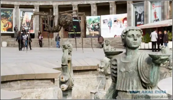 Рядом с ним находится группа статуй, одной из которых является огромный паук, с группой стилизованной под античность скульптур: