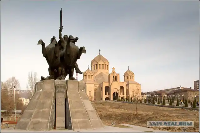 Рядом с собором находится памятник какому-то армянскому правителю, который катался сразу на двух конях, побеждал армянских врагов, а потом забрался на Арарат, где и пропал с концами