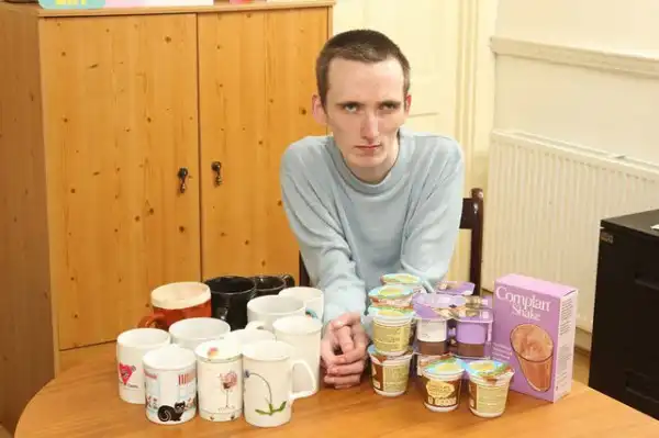 Рацион британца состоит исключительно из жидких и кремообразных блюд. В день он выпивает 10 чашек чая (на фото), 10 шоколадных муссов из сети супермаркетов Tesco и съедает четыре баночки заварного крема «Амброзия».