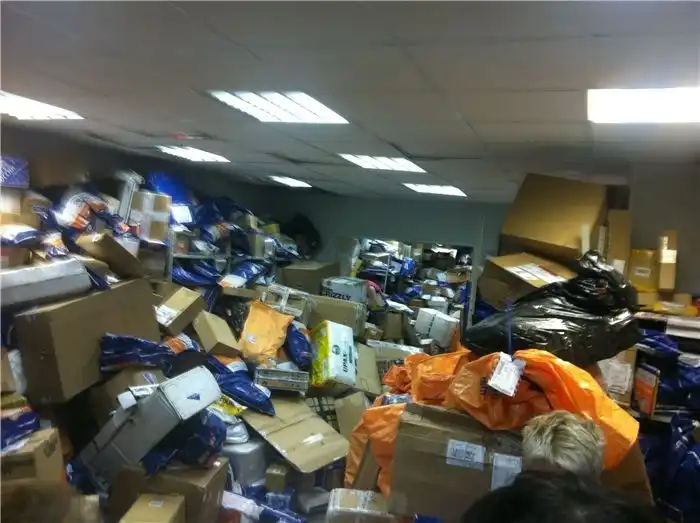 Глядя на эти снимки, я подумал, что они сделаны на каком-то складе после землетрясения. Но я ошибался. Все оказалось намного проще, чем я думал. Это был пункт выдачи посылок "Посты России". Жена автора этих фотографий пришла получить косметику из Кореи, но вместо этого ей выдали пару старых ношеных кед и какое-то грязное тряпье.