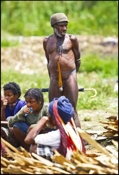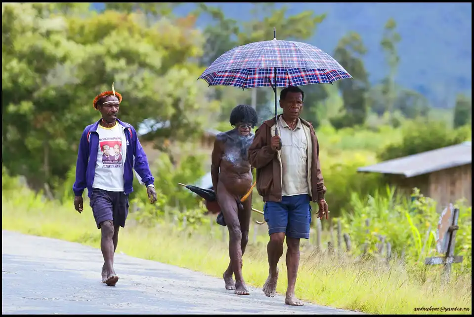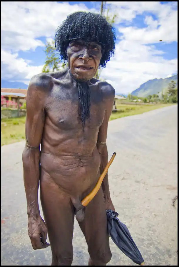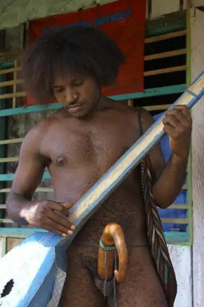 У папуаса котека привязана к телу в постоянно приподнятом состоянии, если эрекция не дай бог прихватит в бою, то всё происходит внутри котеки (котека это пустотелая внутри бутылочная тыква, выращенная особым способом). Поэтому у вождя, самая длинная котека, как никак почти до плеча достаёт, а сколько там внутри, это известно только 5-ти его жёнам :naughty: