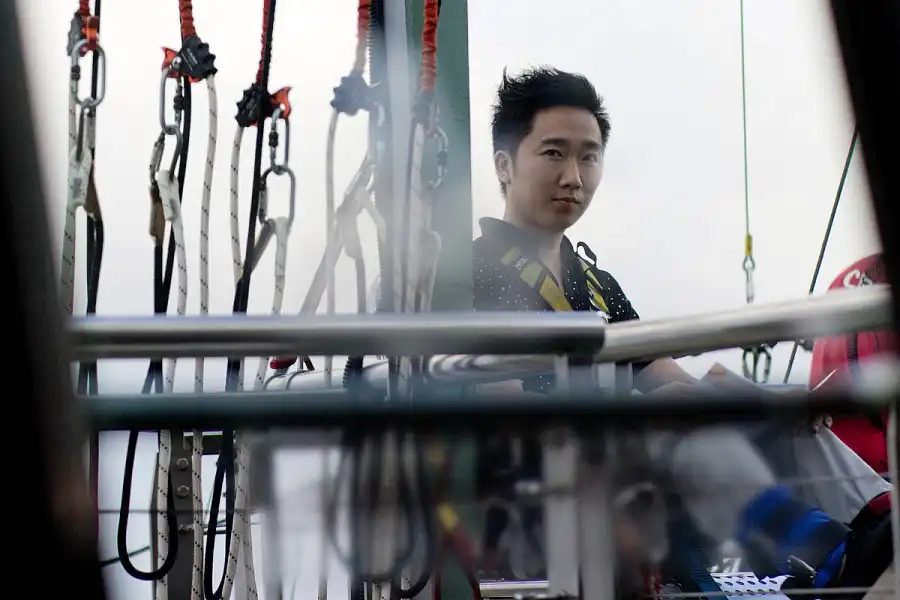 Китайский мужчина за несколько минут до экстремального прыжка с Телебашни в Макао (высота башни 338 метров, прыгают с 233 м., если я не ошибаюсь)