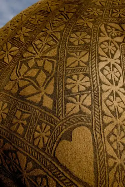 Фотограф Осакабе Ясуо, чьи работы мы представляем вашему вниманию сегодня, рассказывает, что на создание одного такого произведения искусства уходит до трех лет. в первые два года шерсть верблюда только отрастает, ее лишь немного укорачивают особым образом. На третий год, в преддверии фестивалей, шерсть верблюдов выстригается, образуя сложные узоры удивительной красоты, и особым образом окрашивается. Результаты мы предлагаем вашему вниманию.