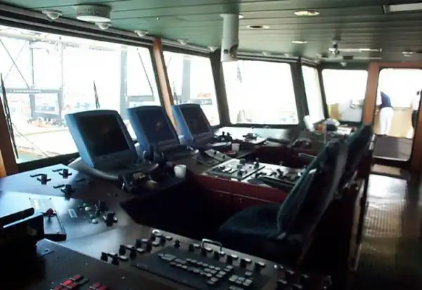 Обычно в море судно идет на авторулевом, при маневрах управляется джойстиком (серая панель по середине). Штурвалы ушли в прошлое.