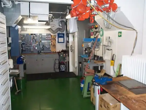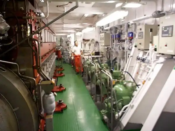 Машинное отделение. Когда работает главный двигатель температура внутри 40 градусов, местами и все 60. Шум превышает болевой порог, поэтому используем защитные наушники.