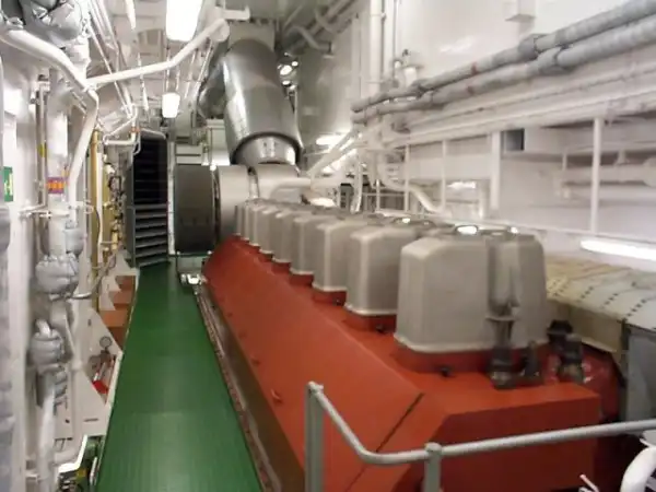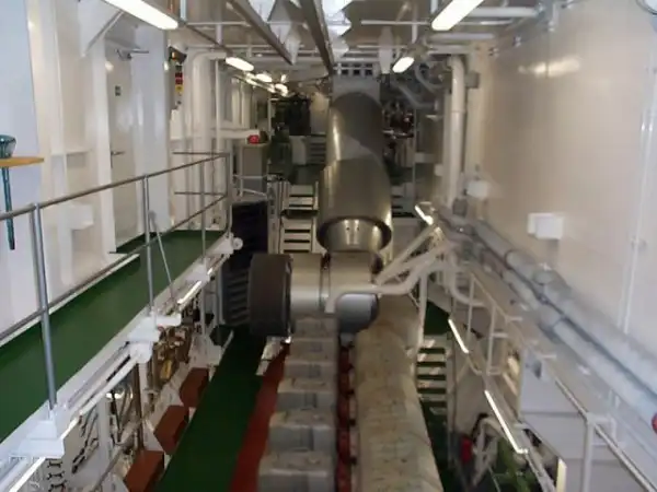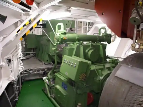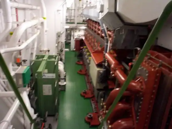 Главный двигатель MAK 9M43 10000 лошадок. Работает на тяжелом топливе - чем то среднем между гудроном и мазутом. Расход на ходу примерно 30 тон в сутки.
