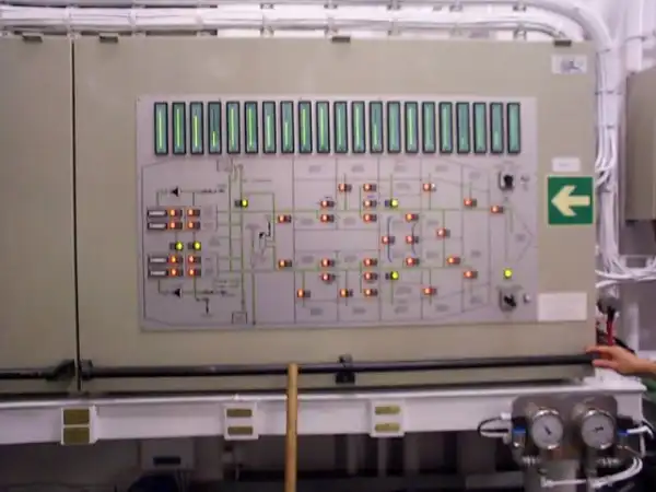 Судно полностью автоматизированно В машинном отделении ночью вахты нет. зато в каютах и всех общественных помещениях стоят блоки сигнализации, на которых можно посмотреть что случилось, если выдет сигнал об неисправности.