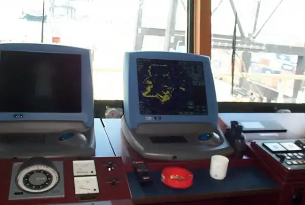 Начнем с мостика. На стоянке пустует, На ходу постоянная вахта 1 человек. По центру - электронная карта, по бокам - радары.