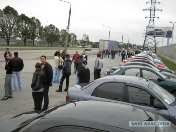 Нас собралось уже приличное число экипажей и народ всё подтягивался. Суммарно ожидалась группа около 90 человек… Вообще в Запорожье Ланосы и Сенсы на каждом углу, но думаю при виде колонны Daewoo с символикой и флагами клуба у местных с новой силой проснулся