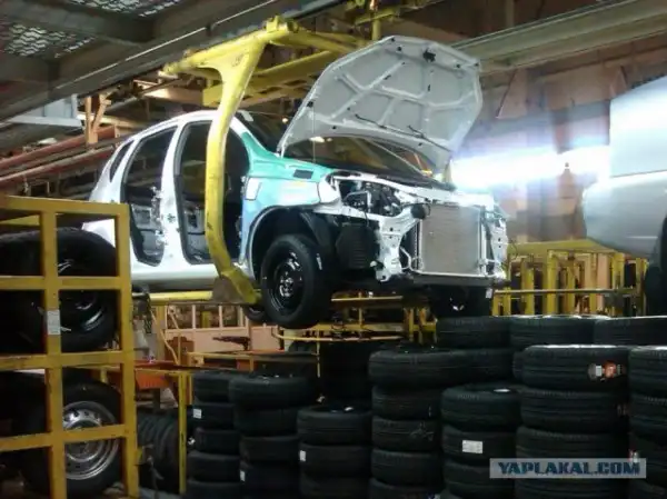 Дальше перемещаемся в цех сборки. При сборке «начинки» крылья и бампера защищаются спец накладками, а двери вовсе снимаются чтобы избежать повреждений.