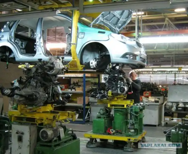 При чем зазоры выставляются не вручную как на АвтоВАЗе, а сразу при сборке автоматически и выставляются роботами. Как и на каждом участке, за этим этапом закреплен контролер (видим женщину в форме) который проверяет отклонения от нормы в выполнении операций и отбраковывает авто.