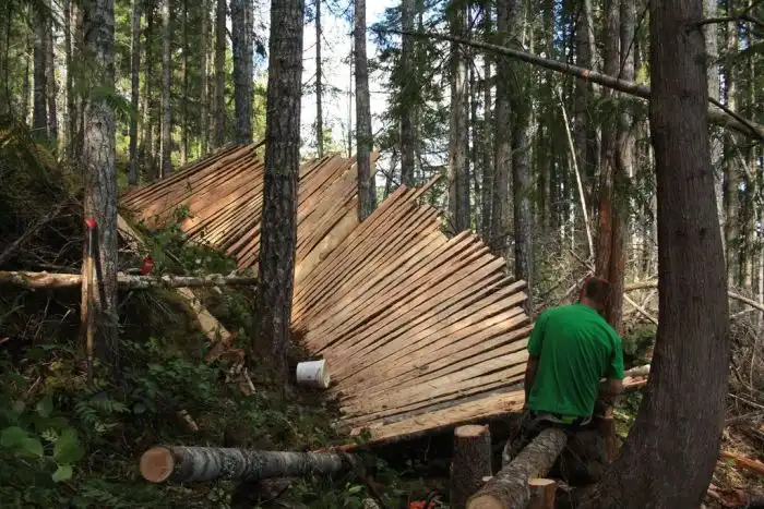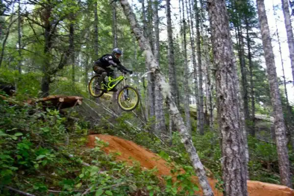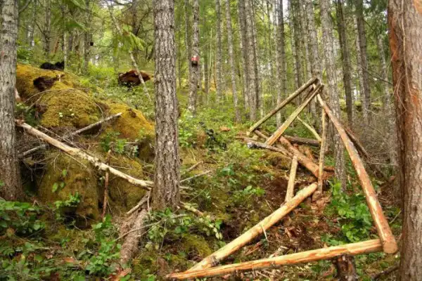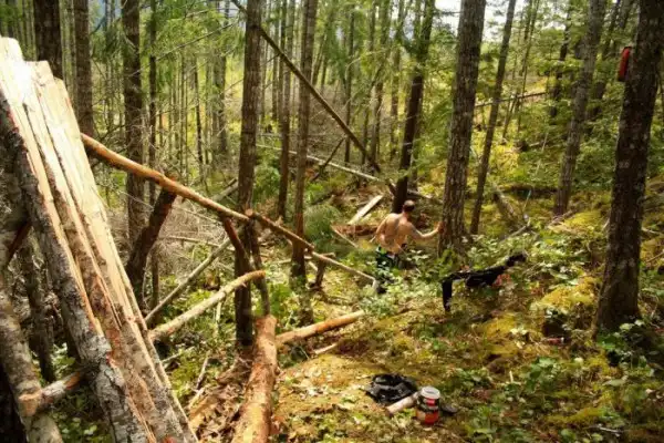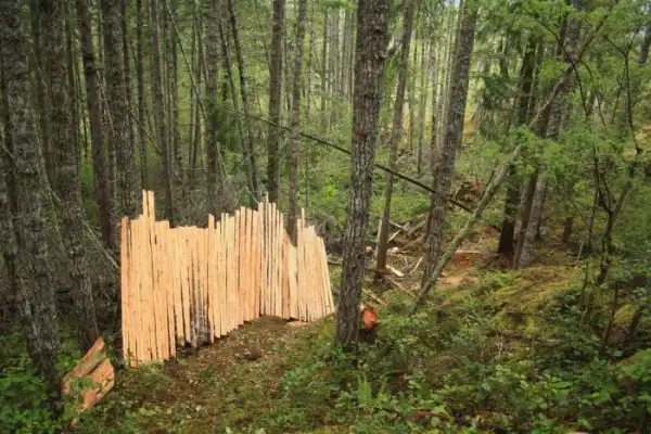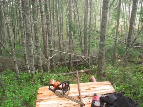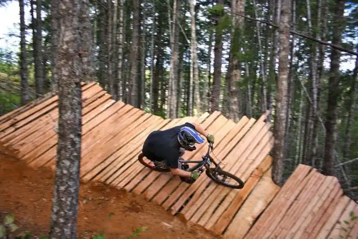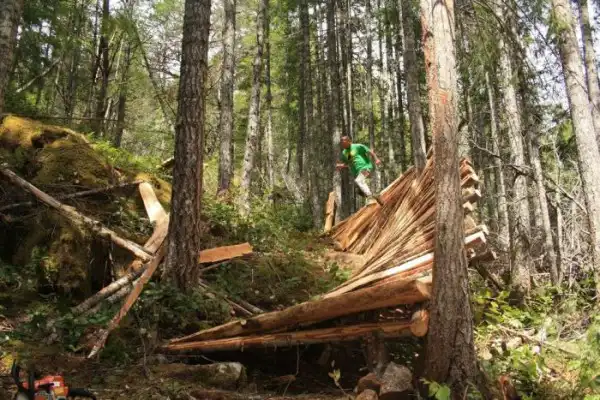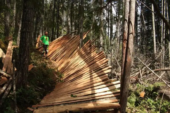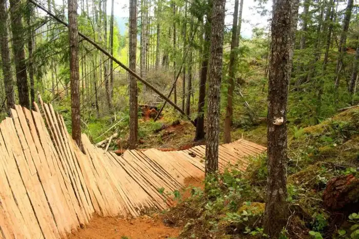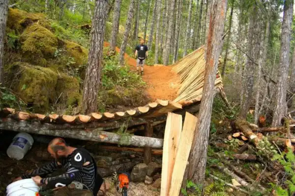 Вот так в глухом лесу делают рампу для экстремальных спусков на велосипеде. Если кто-то хочет заняться спортом, то лес для него не помеха.