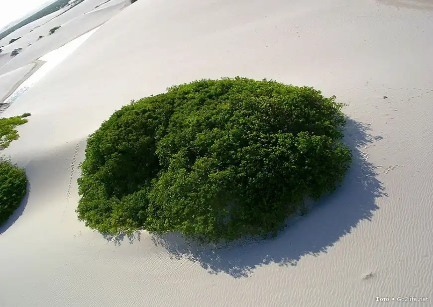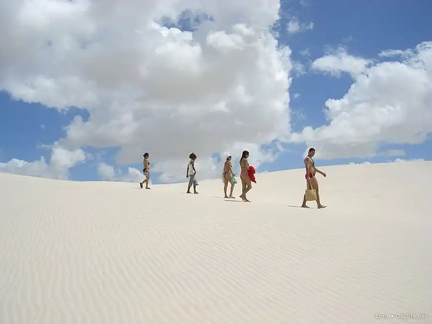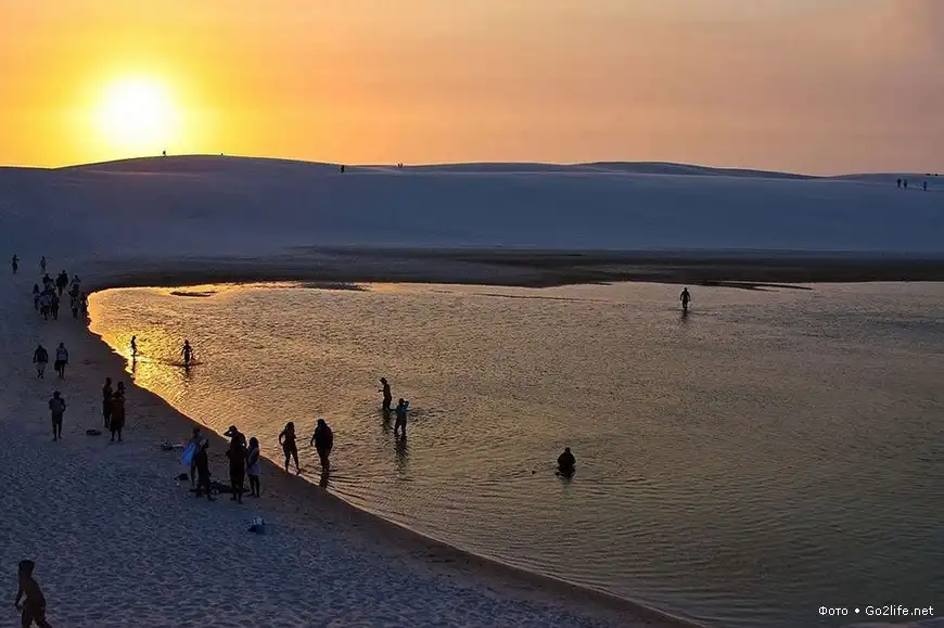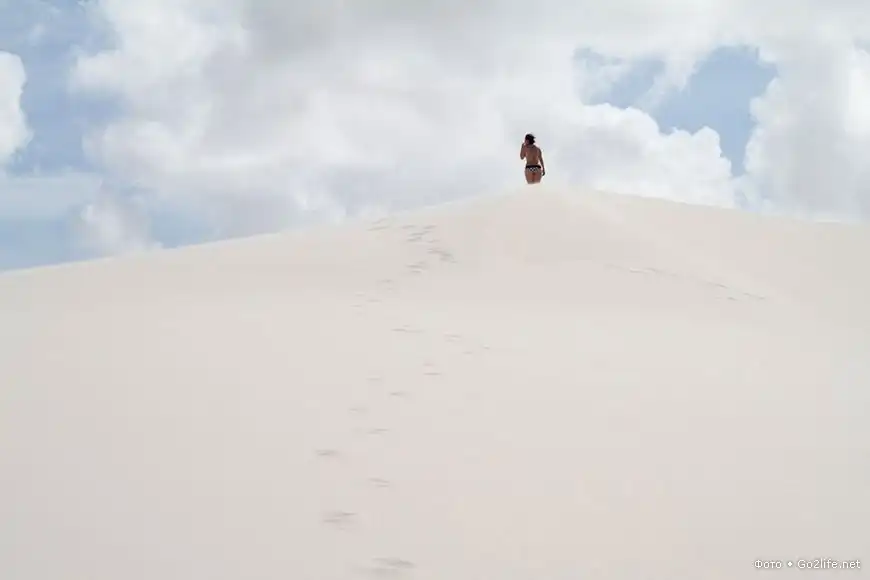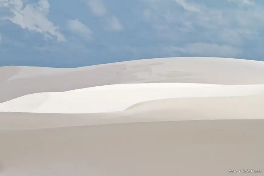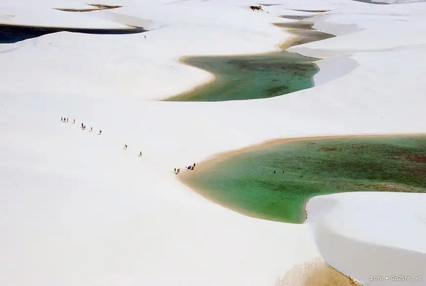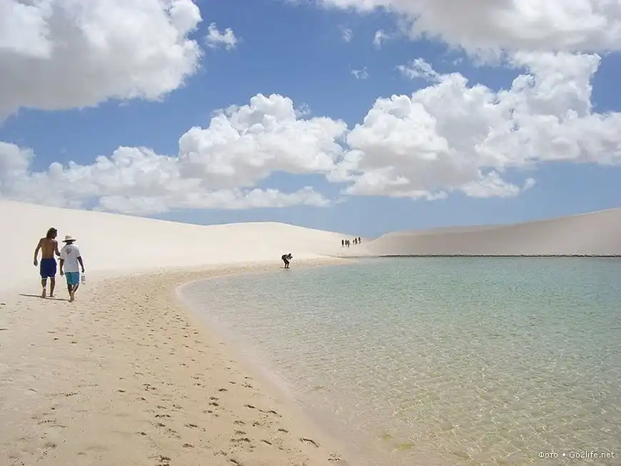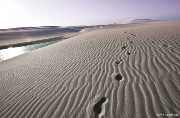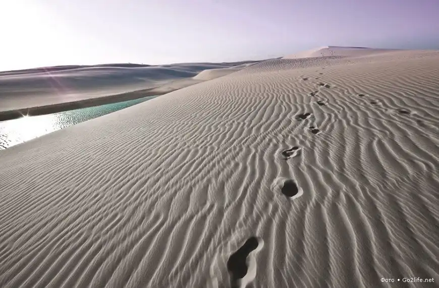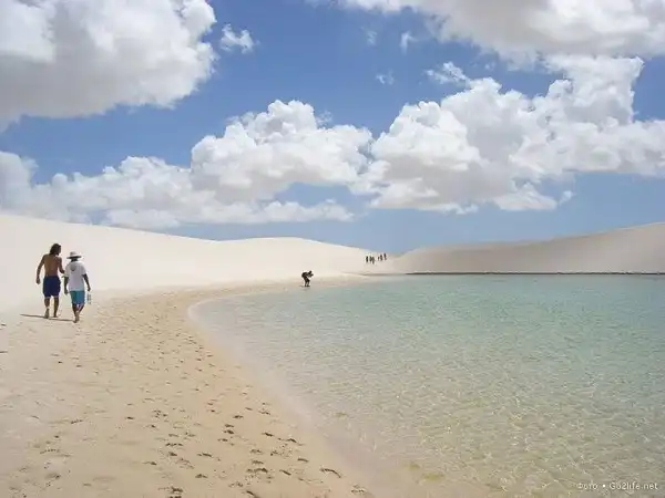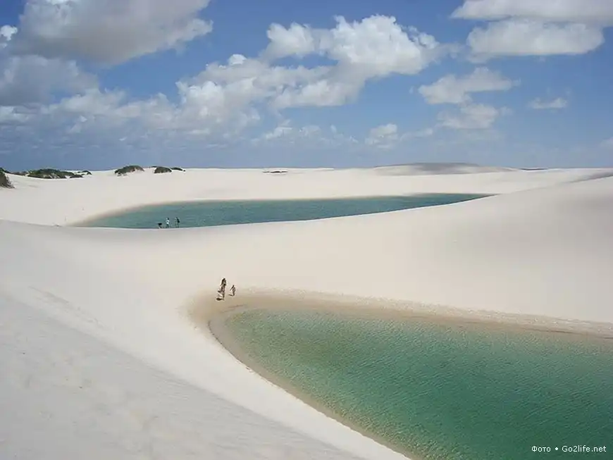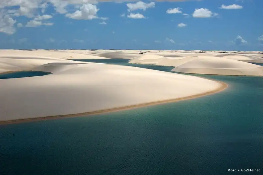 В национальном парке Lencois Maranhenses на севере Бразилии, находится одно из чудес бразильской природы, которое называется – Простыни Мараньяна. На первый взгляд ландшафт в парке напоминает пустыню, но в сезон дождей (здесь выпадет в 300 раз больше осадков, чем в пустыне Сахара) вода накапливается между барханами, образуя чудный по красоте пейзаж – сочетание сине-зеленой пресной воды и белоснежного песка. За свою красоту Lencois Maranhenses дали название "Простыни Мараньяна". Это – потрясающая местность, соединившая в себе дюны, высотой до 40 метров из самого белого на Земле песка и самые колоритные на планете озёра с пресной водой. Во время сезона дождей в парке Lencois Maranhenses расцветает жизнь: прилетают птицы, заплывает рыба, креветки и другая живность. Также оживают неповторимые мангровые заросли до 12 метров высотой, в дебрях которых водятся кайманы, олени, золотистые зайцы и огромные крабы. Такой изумительный ландшафт имеет площадь более, чем 1550 кв. км и уходит вглубь материка на 270 км. В кристально чистых озерах кипит жизнь, чем с удовольствием пользуются жители некоторых небольших селений, находящихся на территории парка. С декабря по март, в течение сухого сезона, температура воздуха в этих районах доходит до +36° С, так что водоемы отчасти высыхают, пропадают и многие их обитатели, а местные жители переходят на активное скотоводство, и ожидают сезон дождей, когда парк снова расцветет. Если посмотреть на парк с вертолета, он становится подобным большому пульсирующему одеялу, которое шевелится по направлению ветра. Загадкой является то, куда девается многочисленная живность во время засухи и из каких мест она возникает. По этому поводу есть различные гипотезы, одна из которых гласит, что икра крабов и рыб сберегаются в песке до возвращения долгожданной воды. Песчаные дюны и лагуны под влиянием воздушных масс непрерывно двигаются, поэтому любой увиденный здесь пейзаж недолговечен и уникален сам по себе. Период с июня по октябрь, когда образование озер достигает предельной точки – это наилучший период посещения парка Lencois Maranhenses. Ежегодно множество туристов прибывают в национальный парк, чтобы полюбоваться первой его достопримечательностью – чарующим сочетанием белого песка и бирюзово-голубой прозрачной воды.
