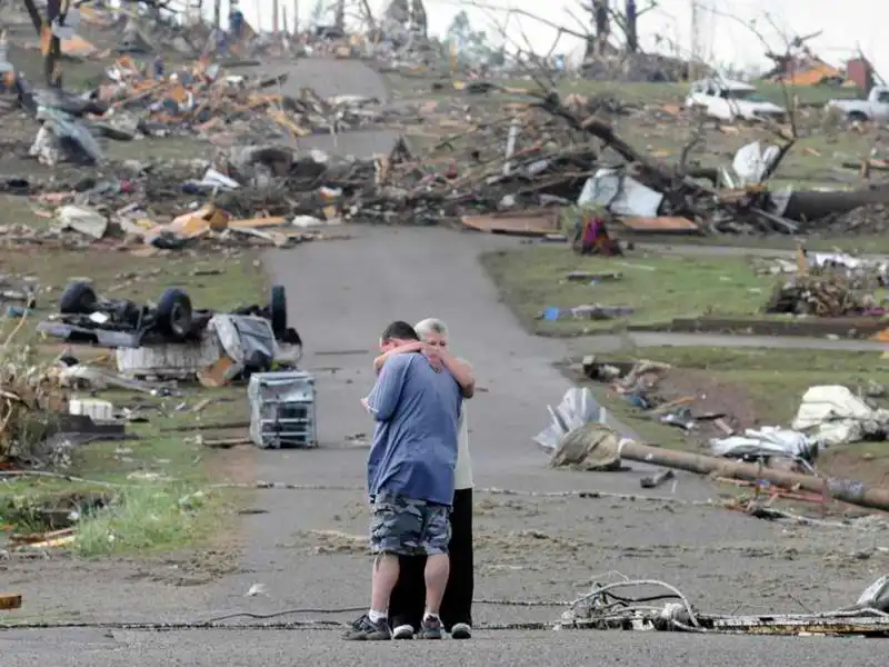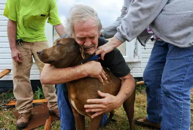 Грег Кук обнимает свою потерянную собаку после того, как та нашлась. Алабама, после Торнадо в марте 2012 года.