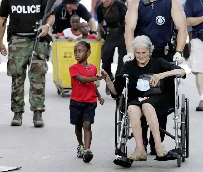 Таниша Блевин, 5 лет, держит за руку пострадавшую от урагана Катрина, Ниту Лагард, 105 лет.